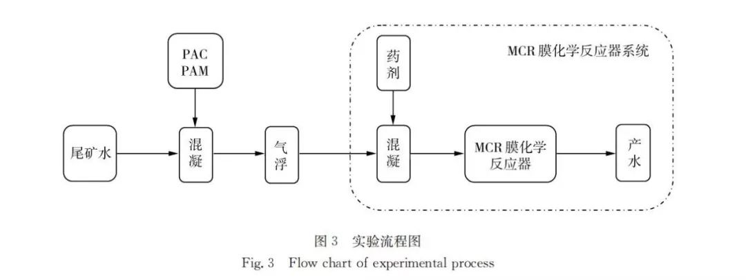 采用气浮+MCR膜化学反应器组合工艺,整体工艺流程见图3所示。取尾矿水,在混凝池内加入PAC、PAM等药剂,经气浮后,上层浮泥撇除,清液进入MCR膜化学反应器系统。根据需去除污染物,在系统前端加入相应药剂,混和液经膜过滤,产水收集测定。在反应器内部,是污泥不断富集并强化反应的过程。